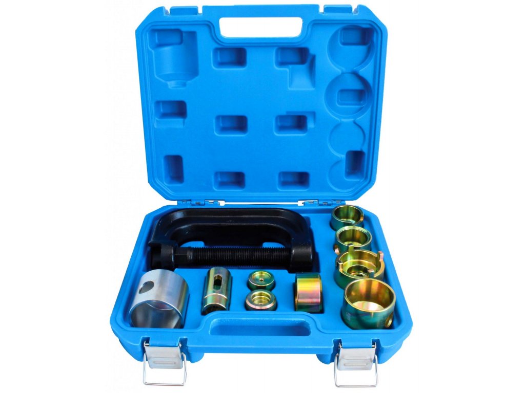 Sada obsahuje mimo jiné: přítlačné prvky pro demontáž a nastavení kulového kloubu v držácích a gumové spojky v předním a zadním zavěšení.
