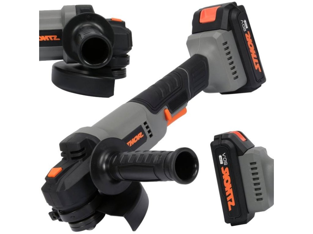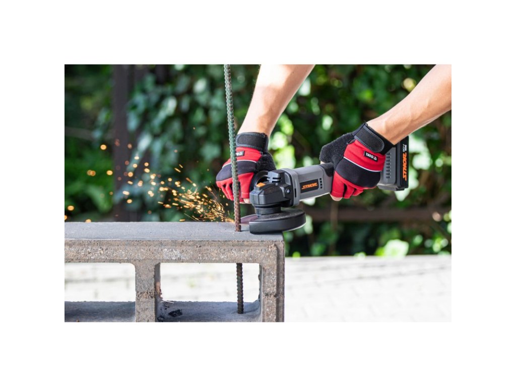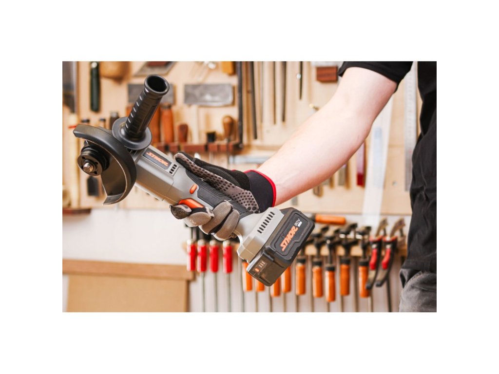 - Akumulátorová úhlová bruska 125 mm 20 V, přídavná rukojeť, kryt brusného kotouče, klíč pro upevnění brusného kotouče