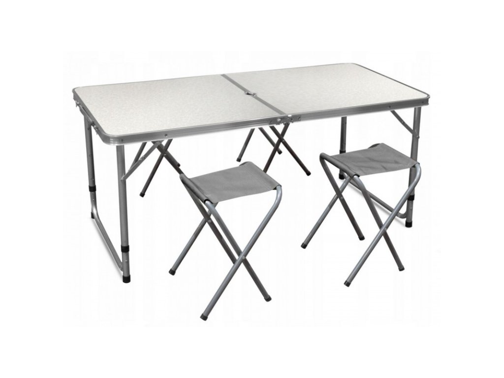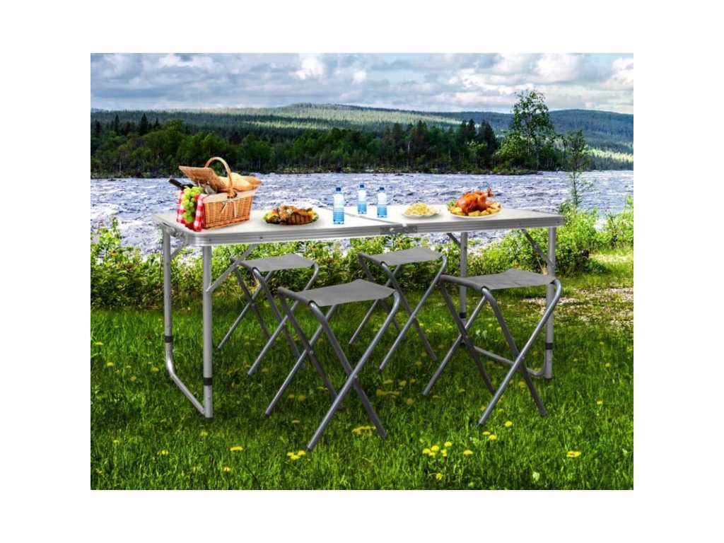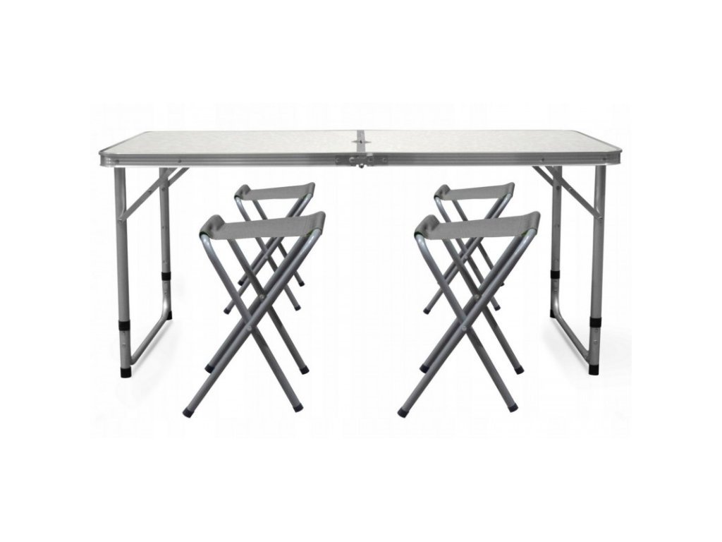 Skládací kempingový stůl o rozměrech 120x60 cm se 4 židlemi a nastavitelnou výškou je praktické a všestranné řešení, které usnadňuje život při každém výletu do přírody a zajišťuje pohodlí a funkčnost za všech podmínek.