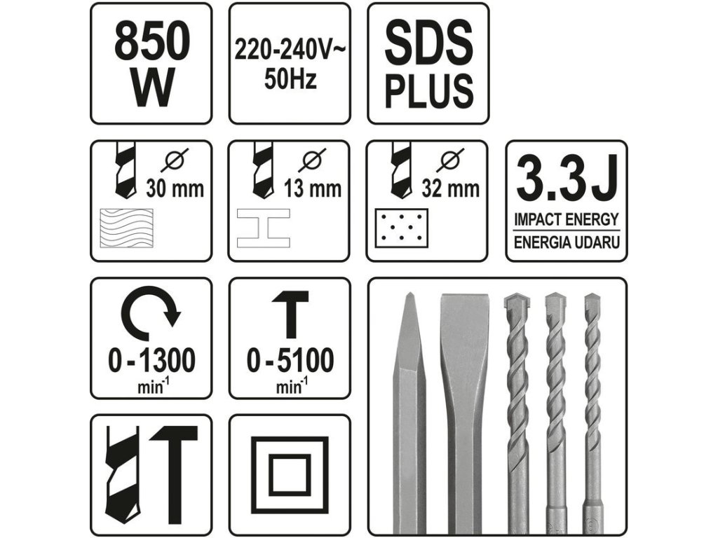 Příklepová vrtačka s výměnnou hlavou SDS+ 850W Yato YT-82122
