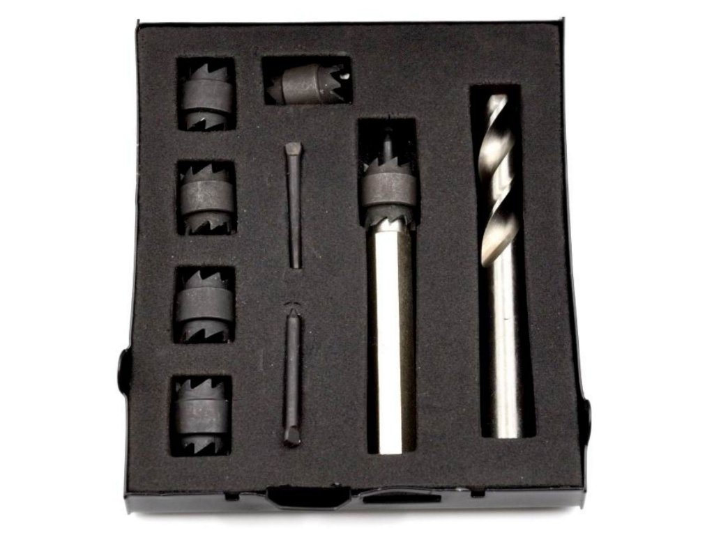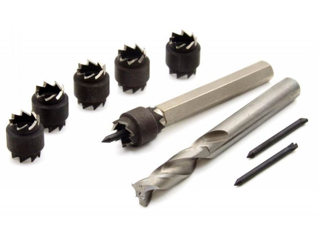 Sada obsahuje 5 oboustranných fréz, upínací sklíčidlo, 2 vřetena a 8 a 9,5 mm HSS vrták.