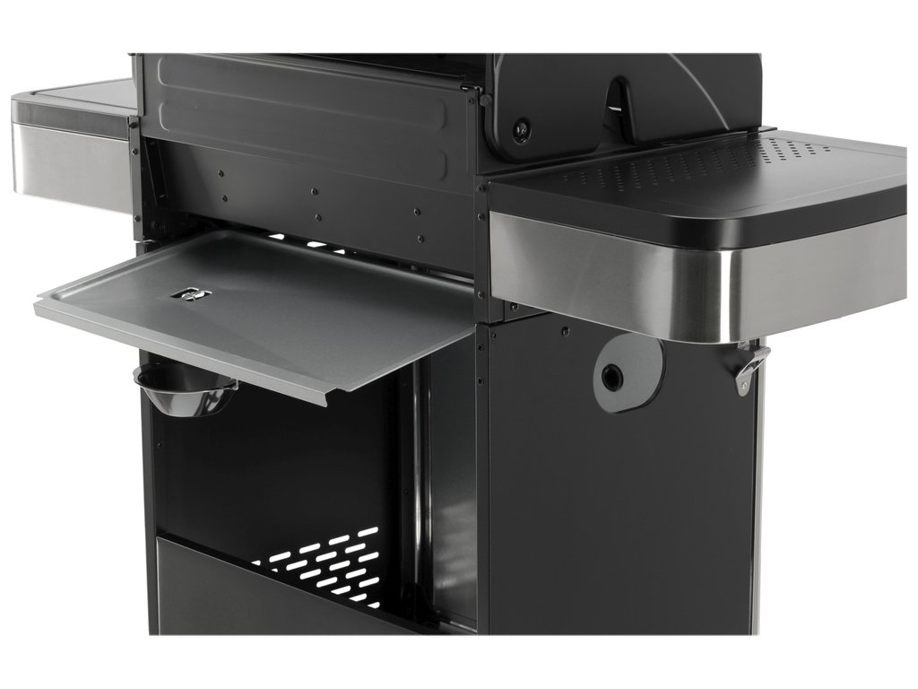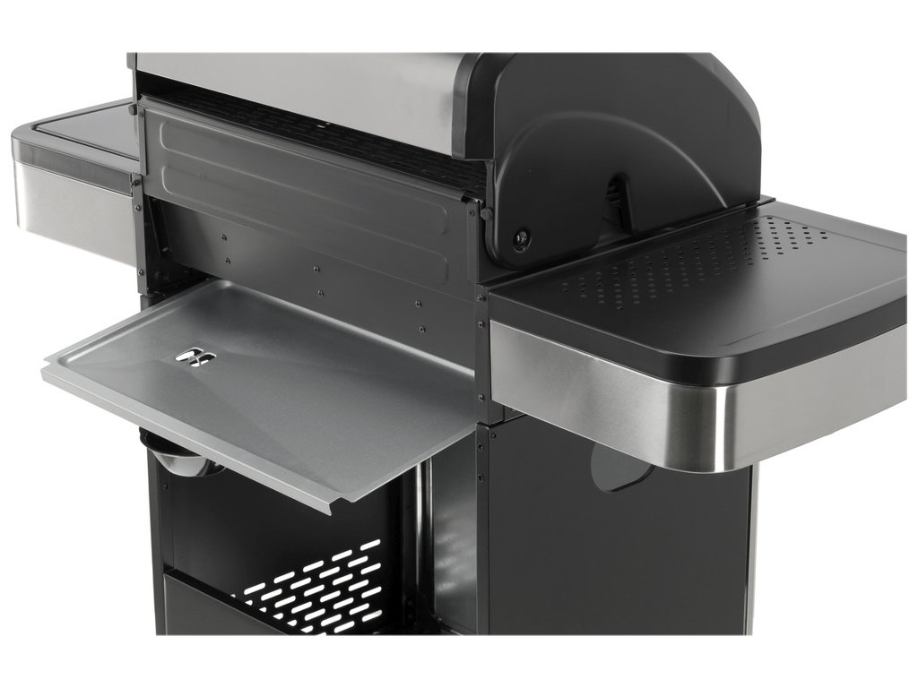 Boční police a prostorná uzamykatelná skříňka usnadní uložení koření a nezbytného příslušenství. Boční hořák o výkonu 2,2 kW vám umožní vařit a ohřívat jídlo v hrnci nebo na pánvi.