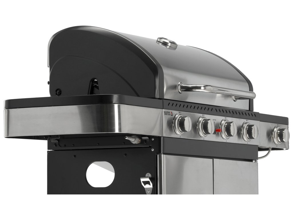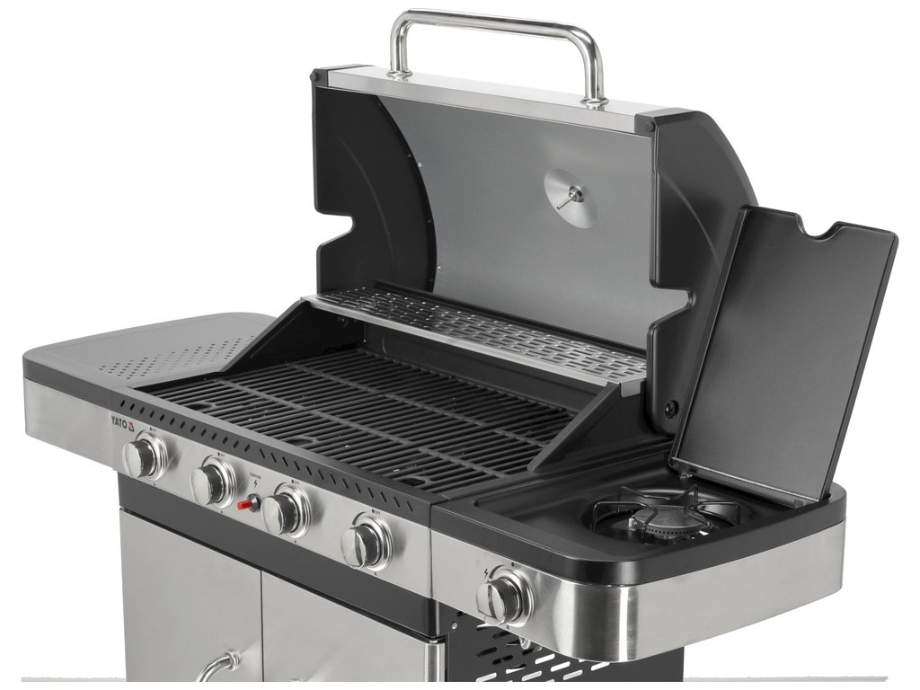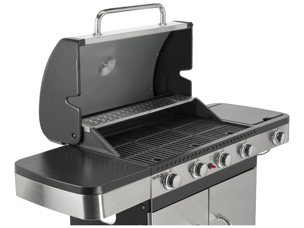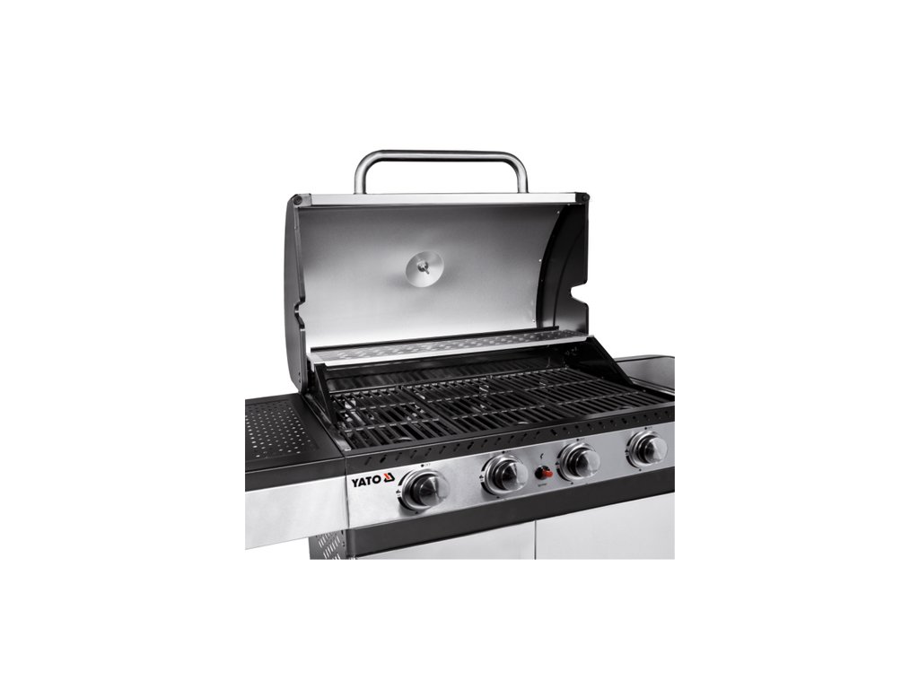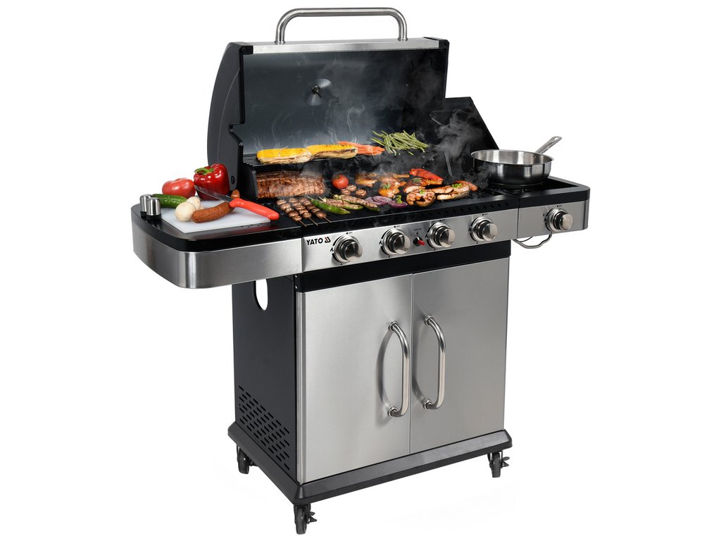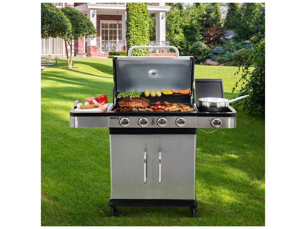 Plynový gril YATO 4+1 s moderním designem, vyrobený z nerezové oceli , vybavený spolehlivým litinovým roštem .