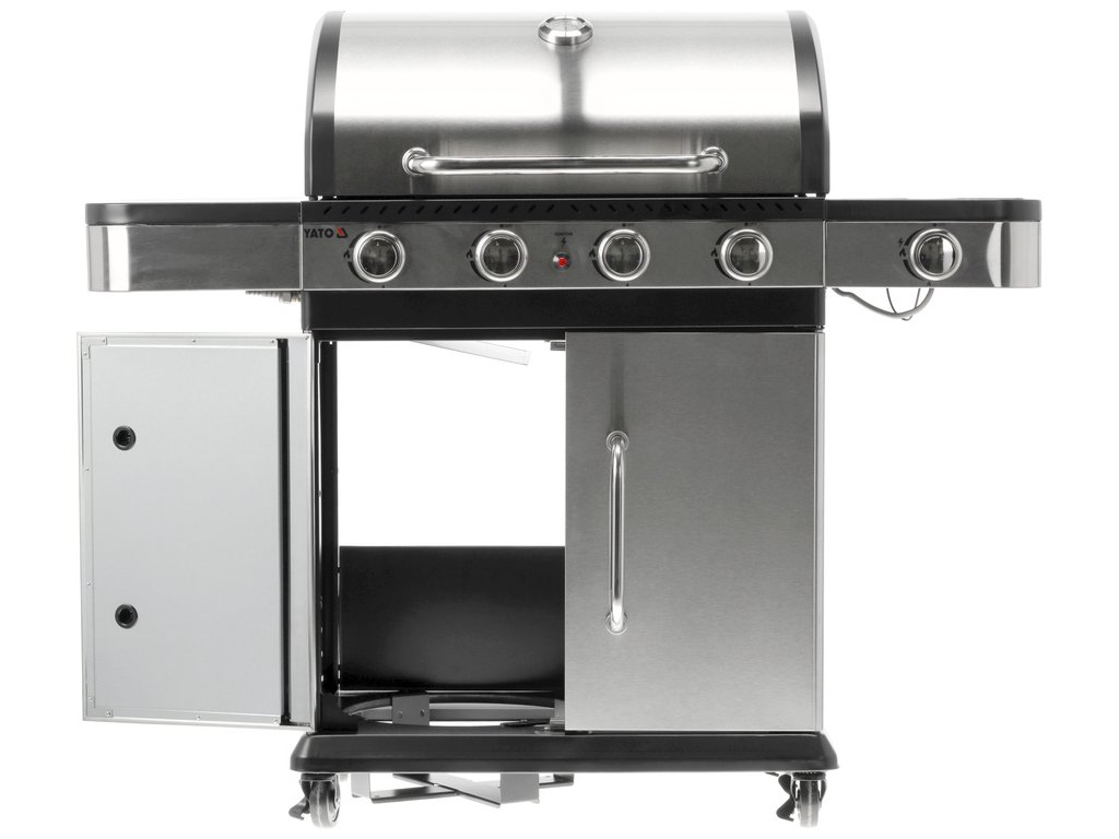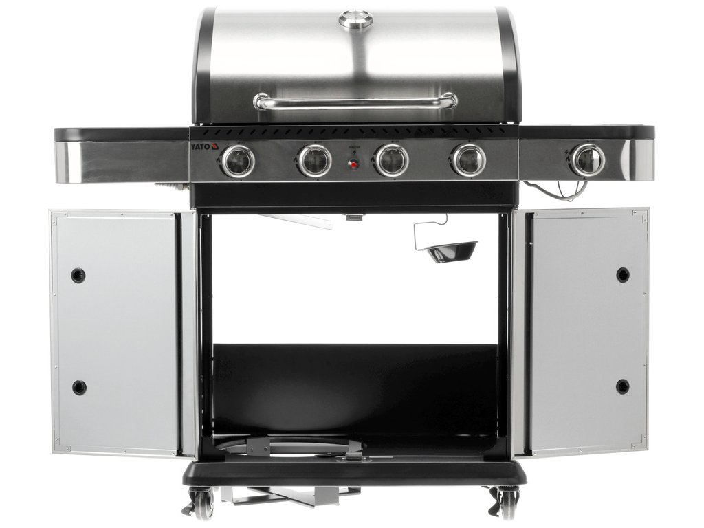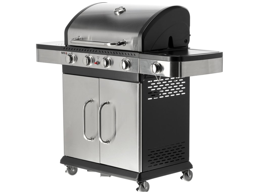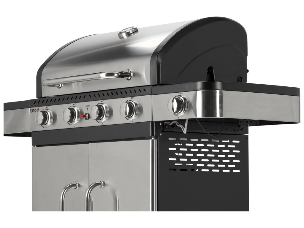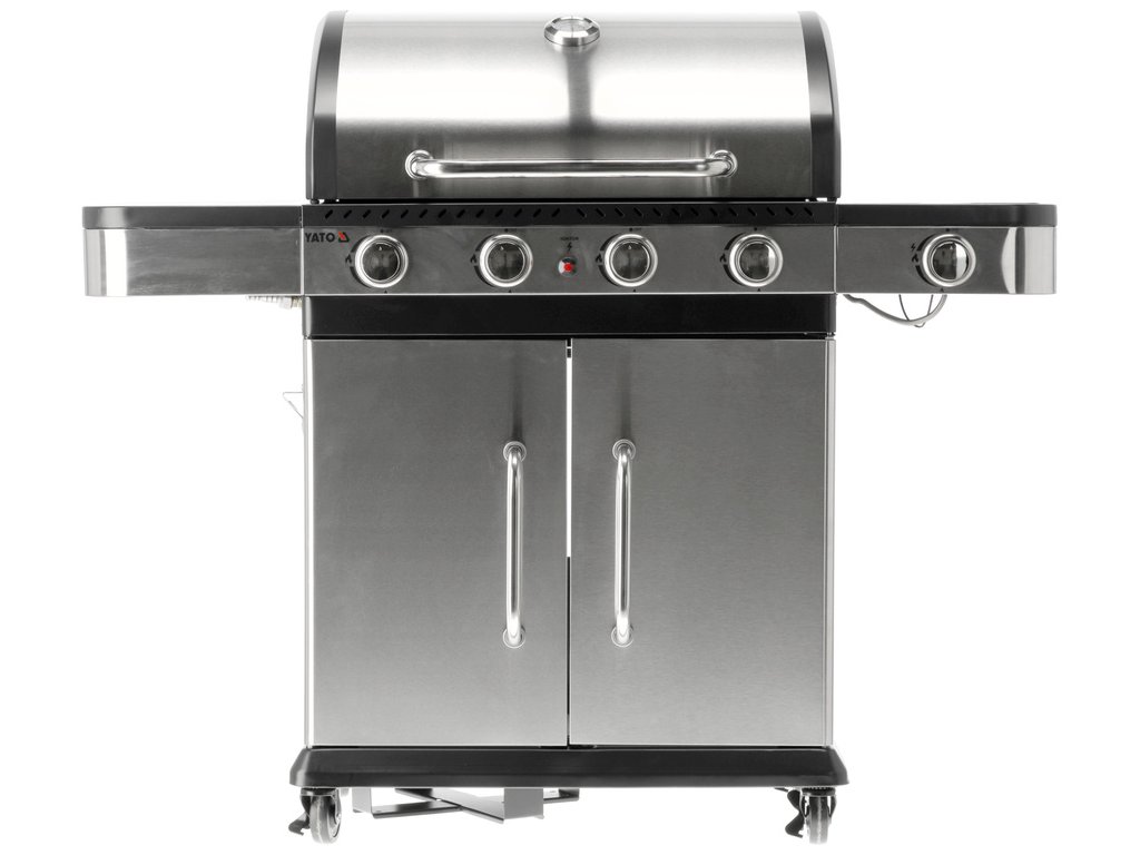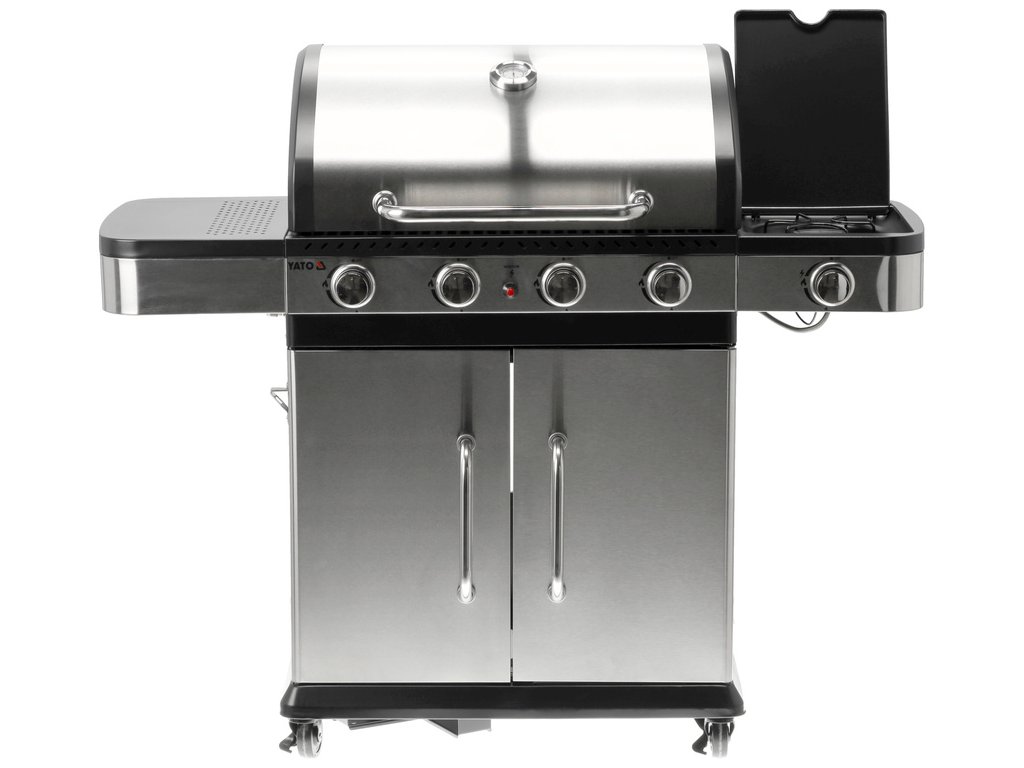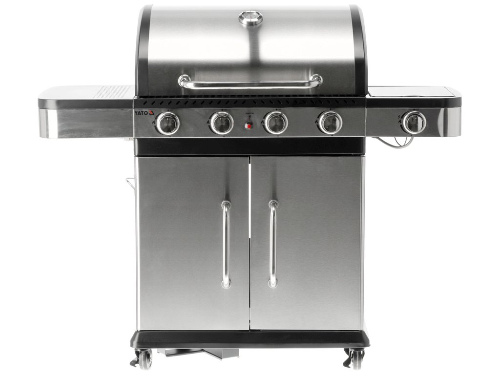Plynový gril YATO 4+1 s moderním designem, vyrobený z nerezové oceli , vybavený spolehlivým litinovým roštem .