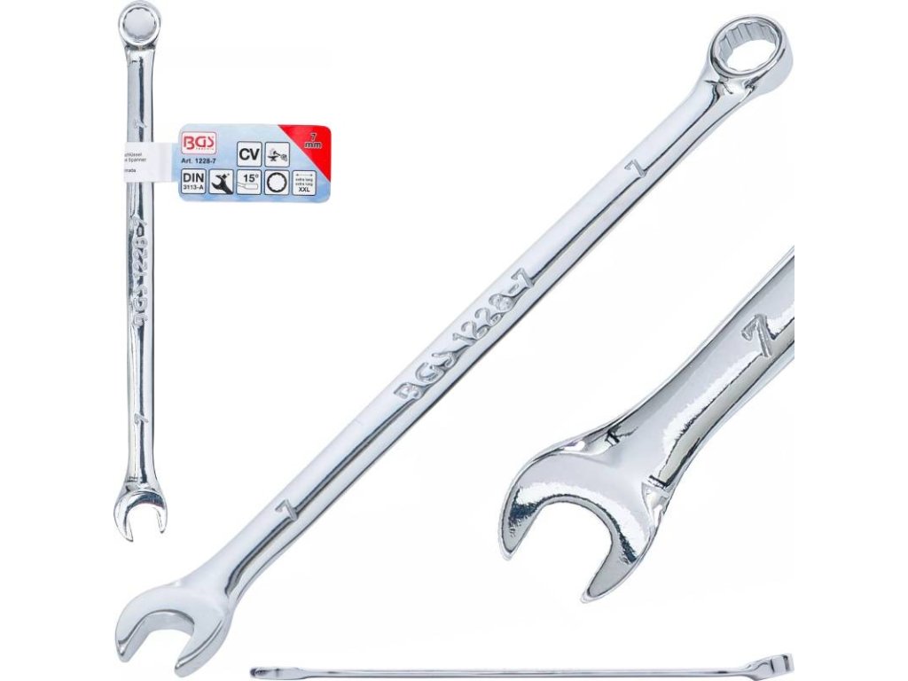 ✅Dlouhý otevřený klíč 7 mm, kovaný za studena, kalený, vysoce lesklý chrom, očkový konec ohnutý pod úhlem 15°