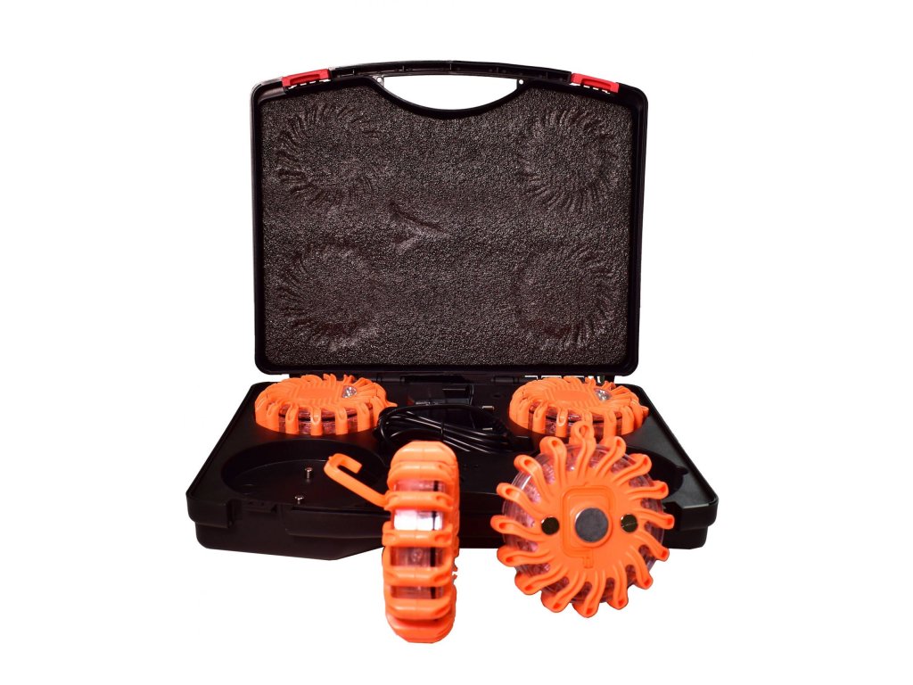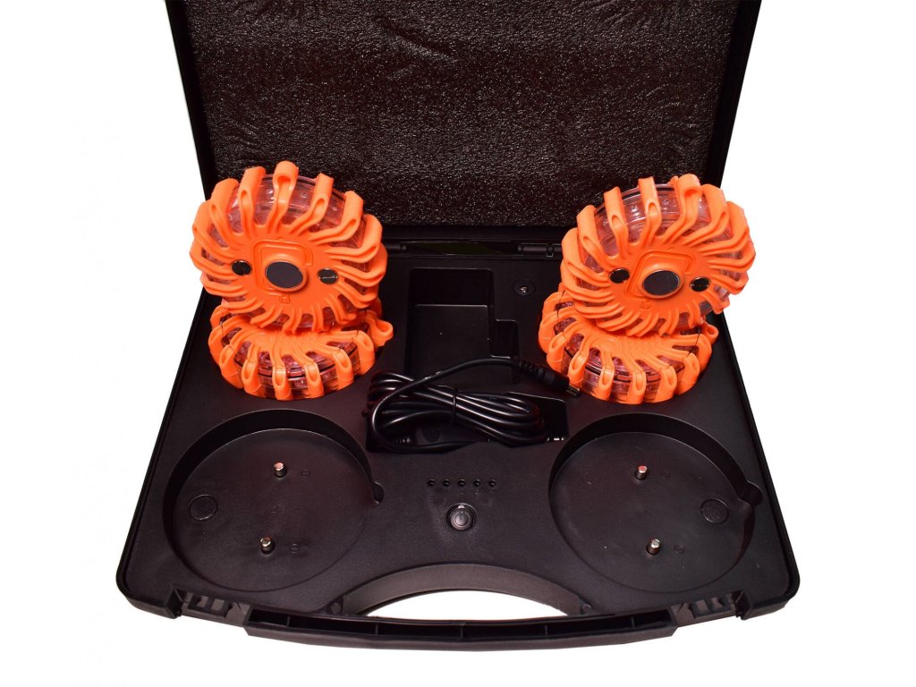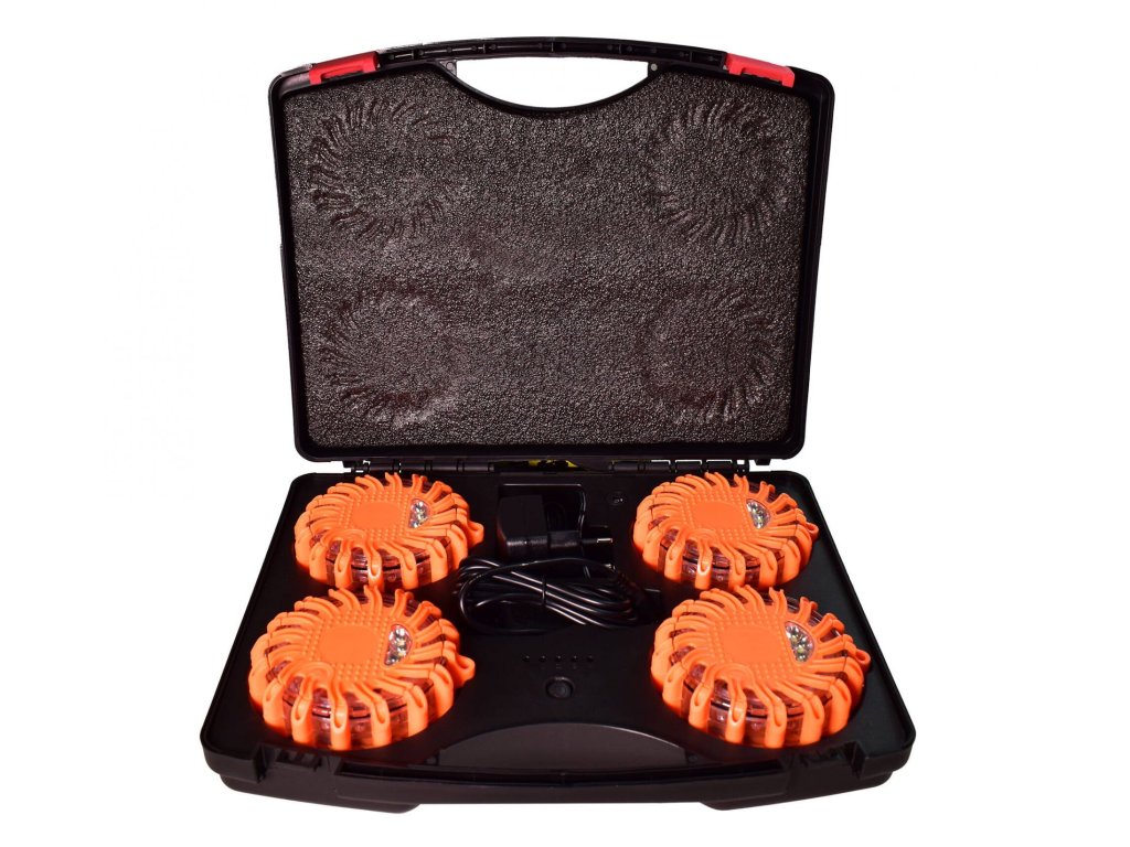 Tato sada 4 LED výstražných světlic je zabalena v kompaktním přepravním pouzdře, které umožňuje nabíjet 4 světlice současně.
