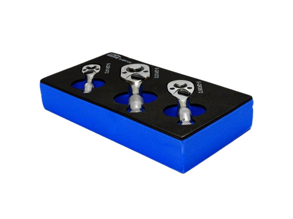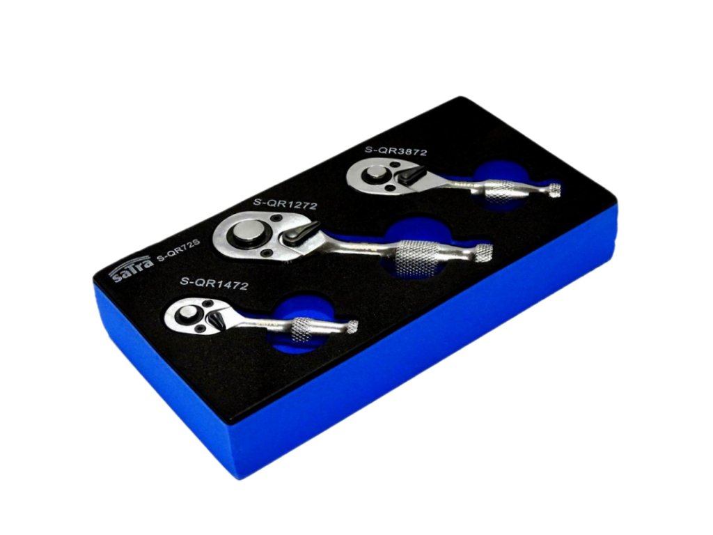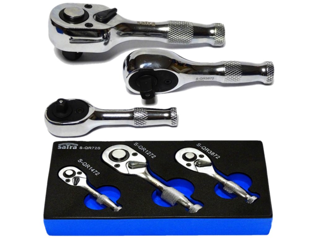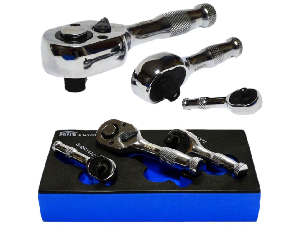 3-dílná sada ráčen s krátkou rukojetí a funkcí rychlého uvolnění přítlačné hlavy na ráčně.