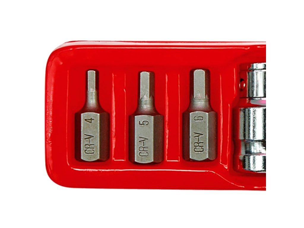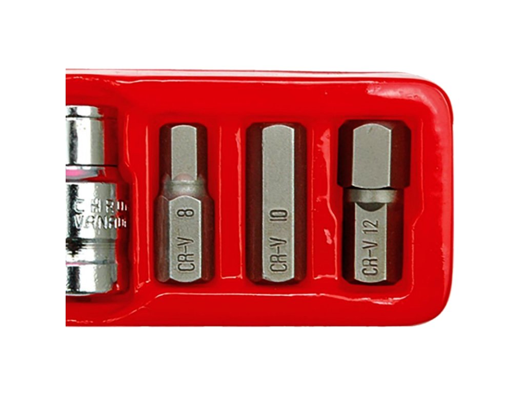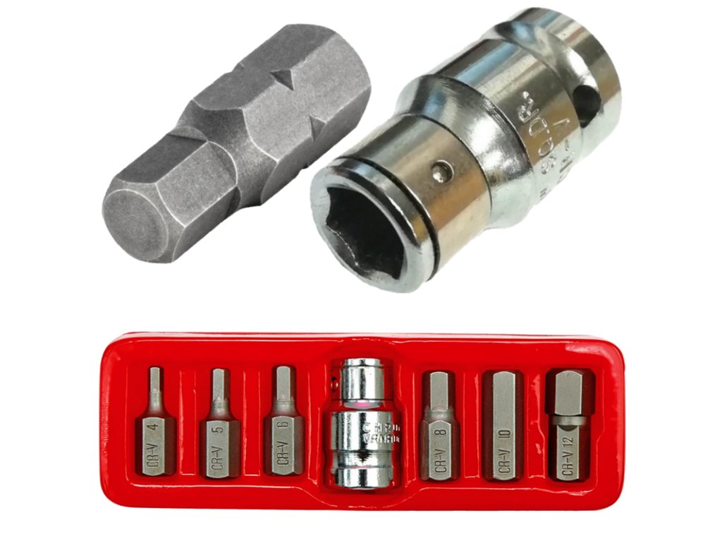 ✅7dílná sada obsahuje 6 bitů o velikostech 4, 5, 6, 8, 10, 12 mm a adaptér se vstupem pro ráčnu 1/2'.
